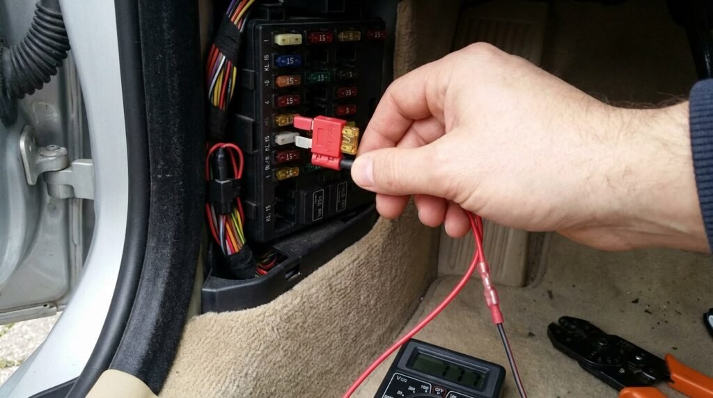 - 🔌 La solution propre : La méthode la plus sûre est d’utiliser un « Fuse Tap » (porte-fusible voleur) dans la boîte à fusibles située derrière la boîte à gants.